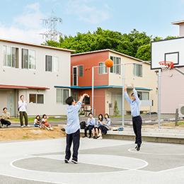 主要な事業所の敷地には保育所を併設。また、バスケットボールコートがあり近所の子どもたちが遊びに来る事業所もあります。入居者が多世代と自然と交流できる環境をつくっています。