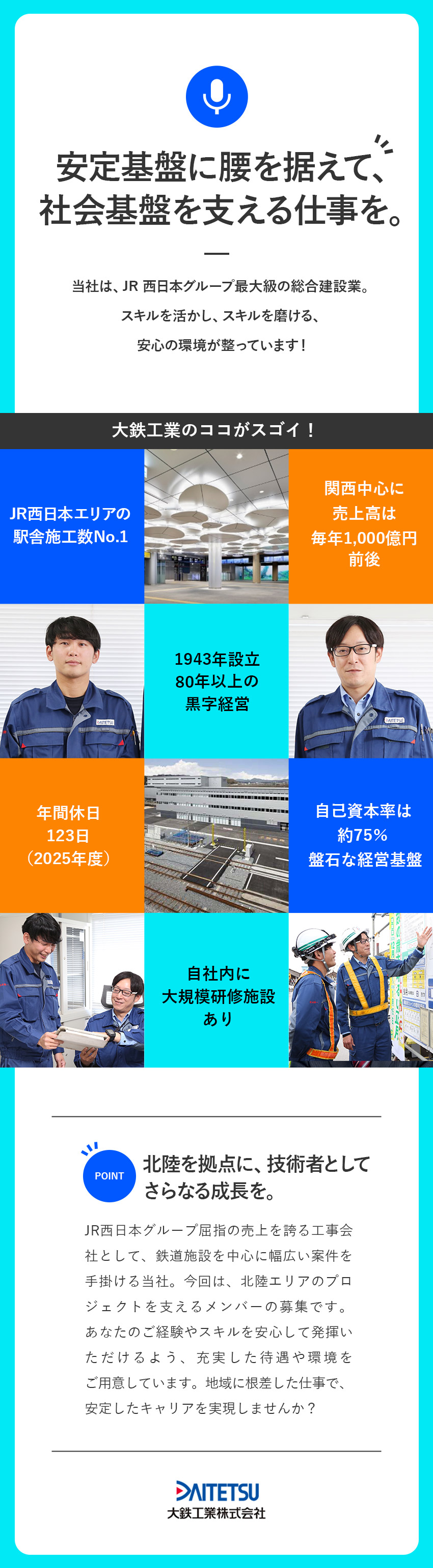 第二新卒【北陸|転勤基本無】土木施工管理<26年4月入社で新卒同様の研修>JR案件9割/鉄道関連も