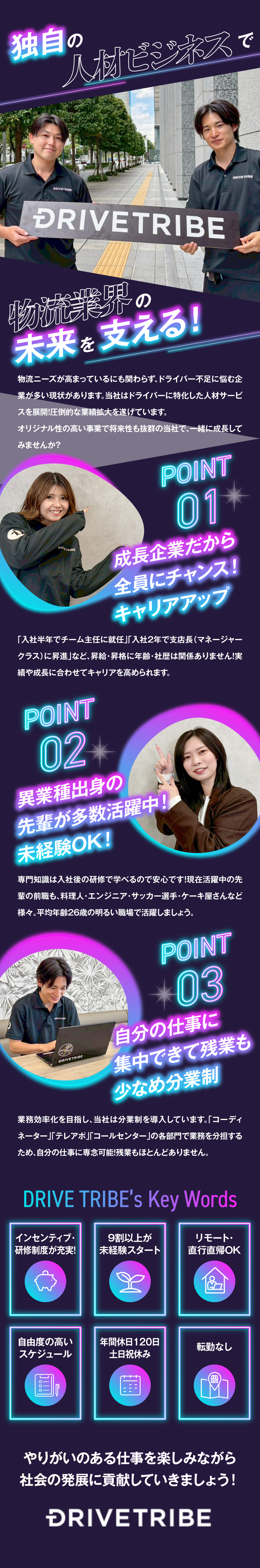 目標は、ドライブワーカー人材サービス業界No.1です!ドライブワーカーは世の中が変わり、新たなモノ(サービス)が創られる新しい世界でも、私たちの生活においては必要不可欠な職業です。