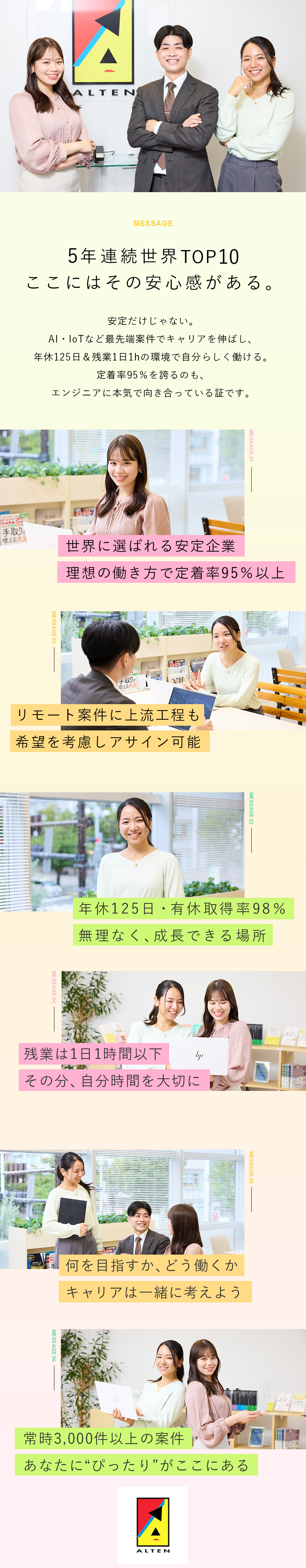 アルテングループは、技術コンサルの分野では5年連続で世界トップ10(2020年~2024年)に選ばれた実績があり、世界的企業・大手国内企業から厚い信頼を集めています。(※)