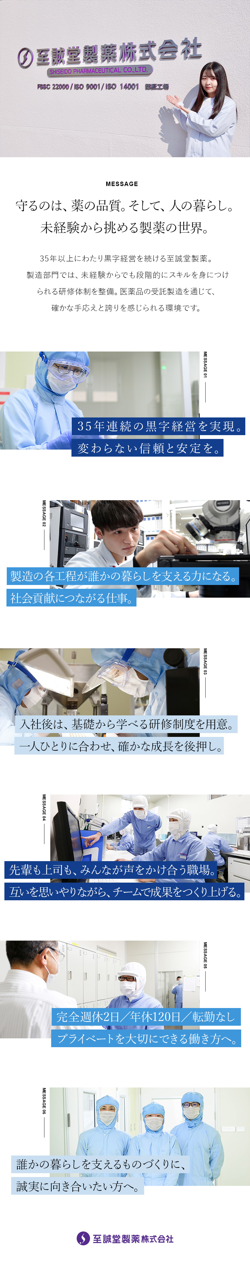 医薬品製造/未経験歓迎/年休120日/転勤なし/残業月18h