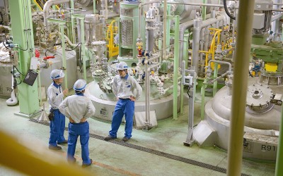 お仕事は、手順書通りに作業を進めていき、原料を計量し仕込み作業や、手順書通りに混ぜたり、加熱したりとチームで協力しながら、化学品製造の基礎を学びます。