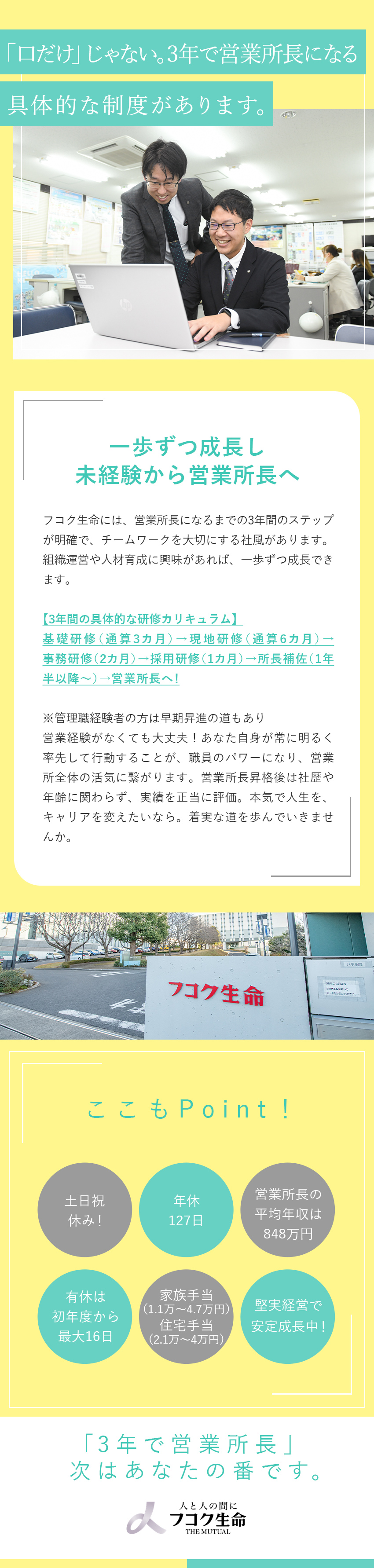 【山梨】営業所長育成コース(未経験歓迎)/年間休日127日/住宅手当有/充実の研修制度/土日祝休