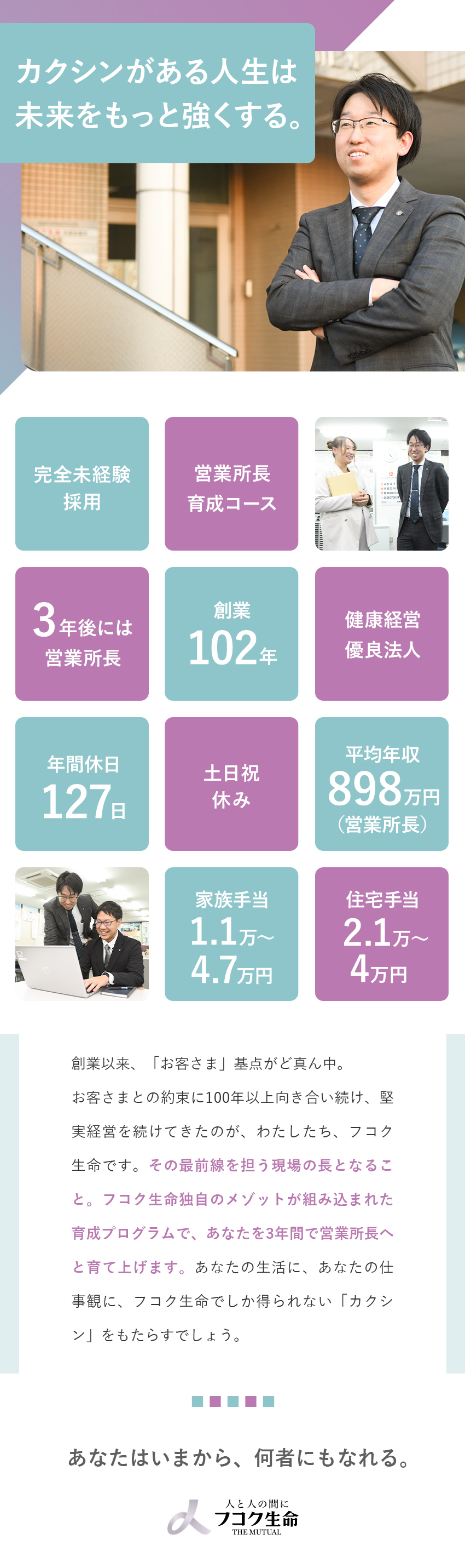 【山梨】営業所長育成コース(未経験歓迎)/年間休日127日/住宅手当有/充実の研修制度/土日祝休