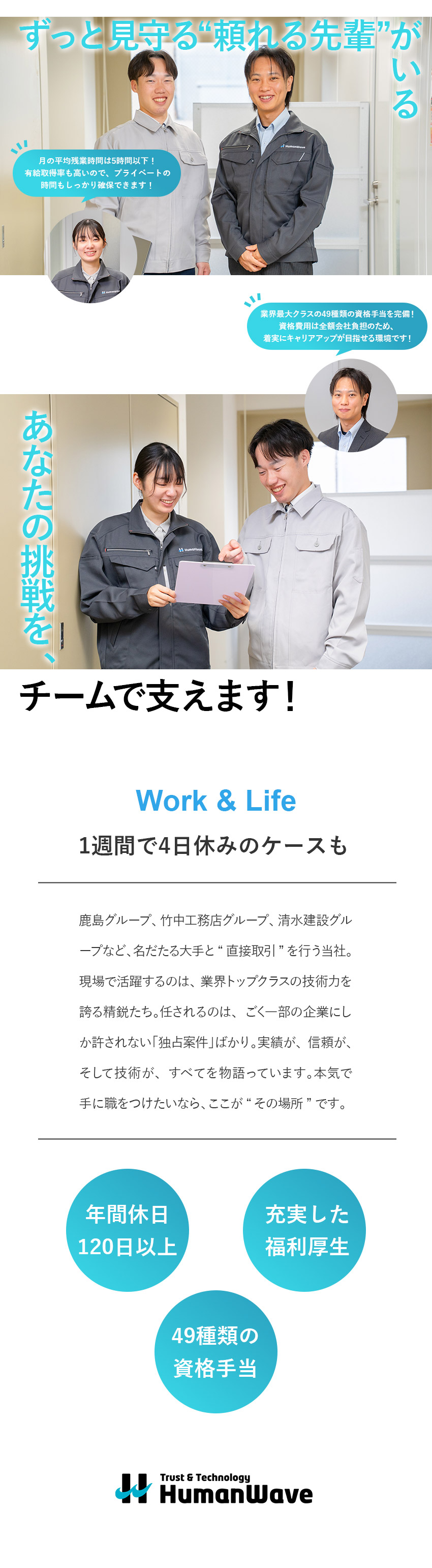 業界最多級を誇る49種類の資格手当をはじめ、充実した福利厚生や柔軟な働き方の整備など、社員一人ひとりが安心して長く働ける環境づくりに、真摯に取り組んでいます。