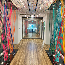 本社エントランス。サイドに伸びるカラフルなラインは、世界中からデータが集まりつながる様子をイメージ。