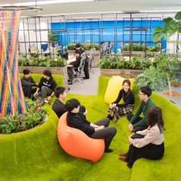 オフィスの中心にある芝生エリアでは、社内イベントや日常のリフレッシュスペースとして活用しています。