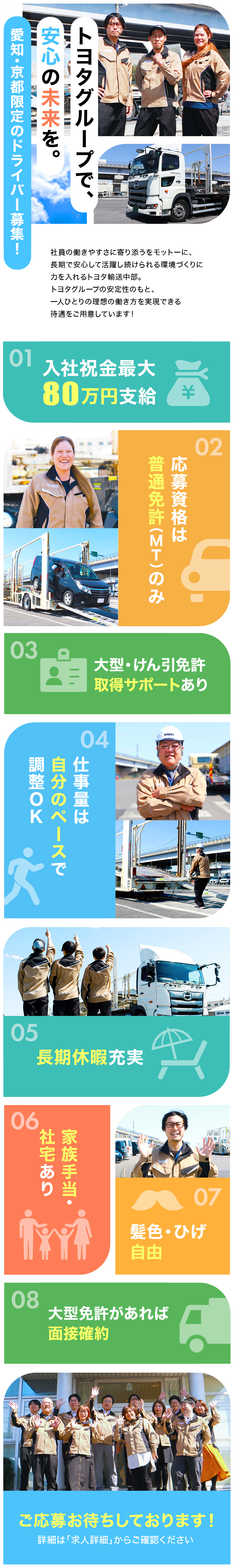 トヨタグループの一員として、安定した経営を続けるだけでなく、国交省指定の「働きやすい職場認証」を取得する同社。社員の働きやすさを追求した職場環境が整っています。トヨタの生産計画に合わせて運営するため、1ヵ月前にはスケジュールが確定。そこから社員の希望に沿って業務が割り振られ、社員の希望に応じた柔軟な働き方が可能です。「残業少なめでサクッと帰りたい」「業務量を増やしてガッツリ稼ぎたい」など、ライフスタイルに合った働き方を実現できます!