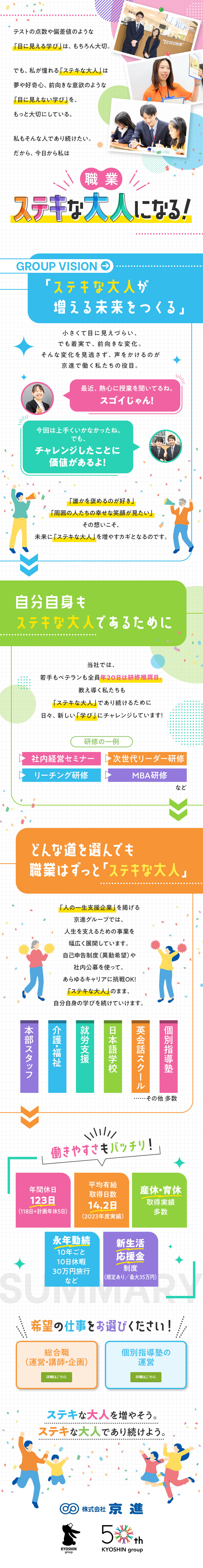 そして、京進の社員もまた「ステキな大人」の一員。ひとりひとりの好奇心や夢、意欲を大切にして、常に自己研鑽しています。もし「今からでもステキな大人を目指したい」と思ったら、まずは一度、選考にお越しください。