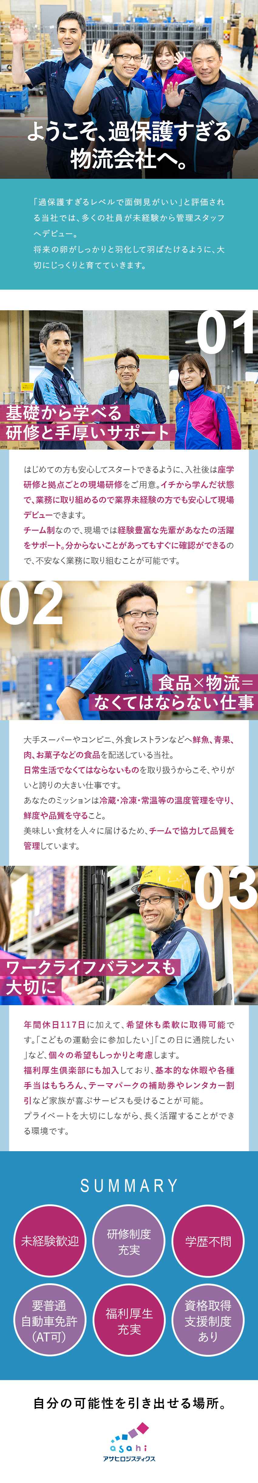 アサヒロジスティクスは、私が学生時代バイトをしていた飲食店の取引先でした。就職活動のなかでどうもしっくりくる求人がなかったのですが、バイト先の方から「(当社が)丁寧で時間配分もしっかりしているよ、