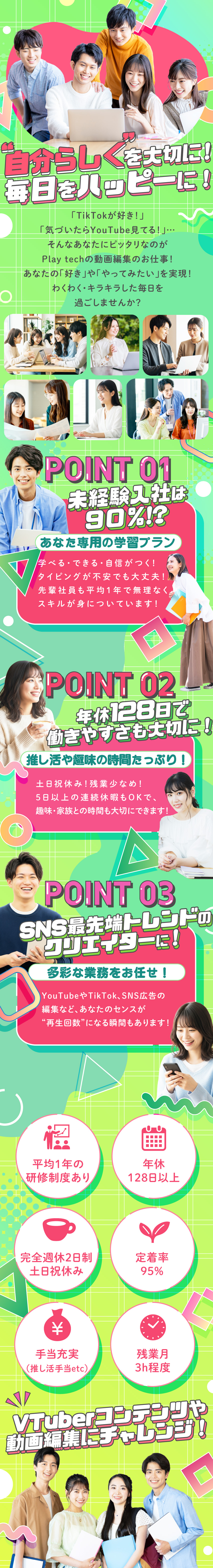 未経験スタートでも、編集ツールや映像の基礎からしっかり学べる研修体制が整っています。切磋琢磨できる仲間との出会い、自分の成長も会社の成長もリアルタイムで感じられる、今だけの貴重なフェーズに携われるのは大きなやりがいです!YouTubeやSNSなど、再生数や反応がダイレクトに返ってくる世界だからこそ、自分の作品が「見られる・届く」喜びも感じられます。