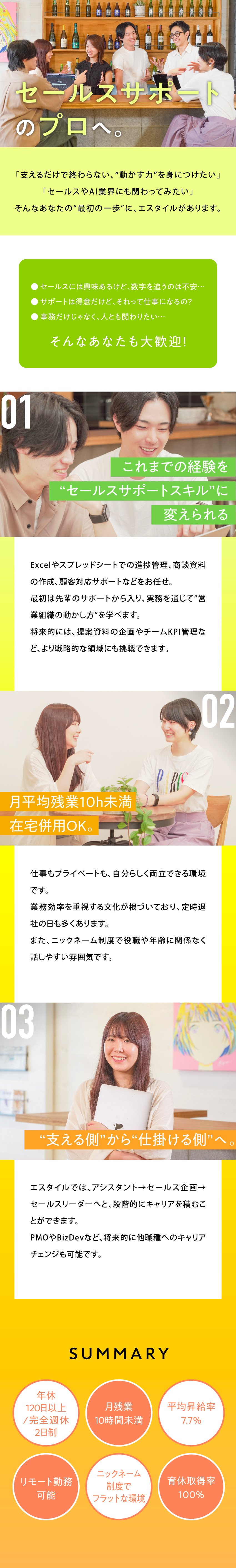 「誰かをサポートすることが好き」「セールスの近くで成長していきたい」そんな方に、キャリアの幅を広げる一歩を踏み出していただけるポジションです。