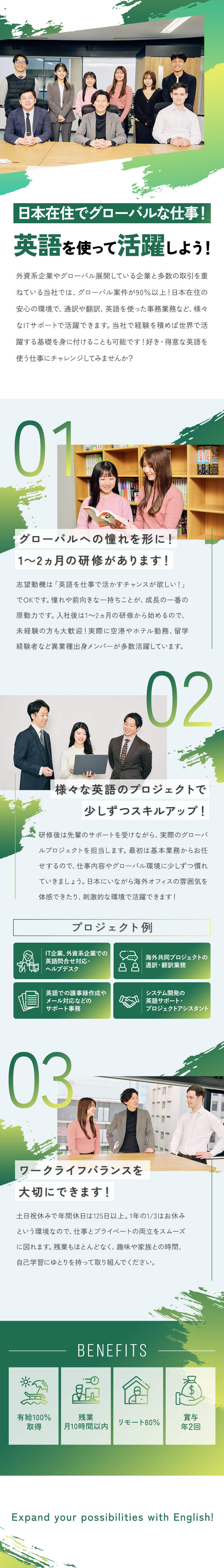 「未経験入社80%」という数字は、同社が人材育成に力を注いでいる証でもあります。一緒に働く仲間は、「英語を活かしたい!」「将来は海外で活躍したい!」という高い志のあるメンバーばかり。チャレンジを楽しめる方には最高の環境です。