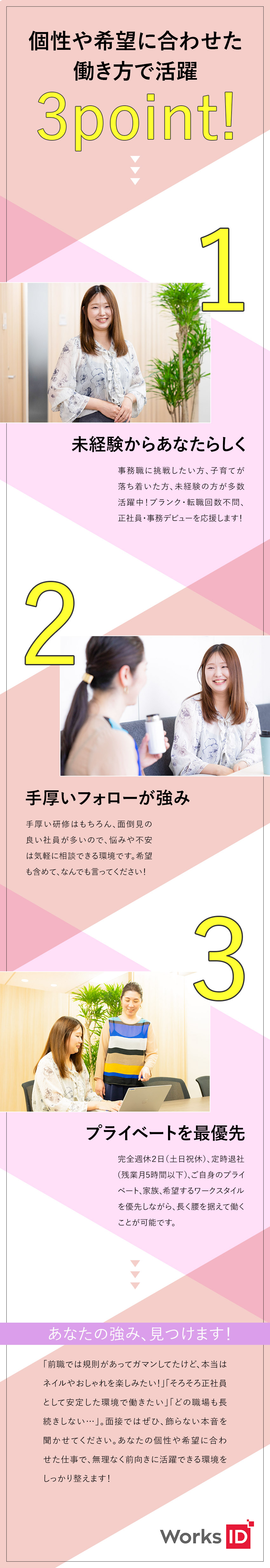 「事務に挑戦してみたいけど、書類でいつも落ちてしまう」「PCの経験が全然なくて不安」そんな方こそ、入口も就業後のフォローも手厚い当社へ!事務の基本から学べる研修もあるので、未経験の方の第一歩に最適です。