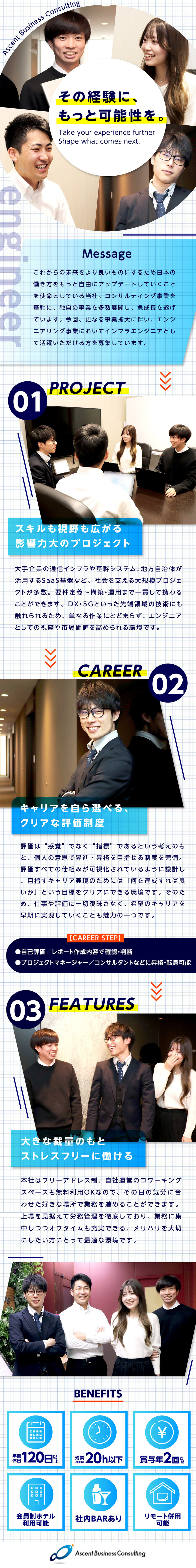 など、多種多様な業界で、社会的影響力の高い大規模プロジェクトに関わることができるだけでなく、
