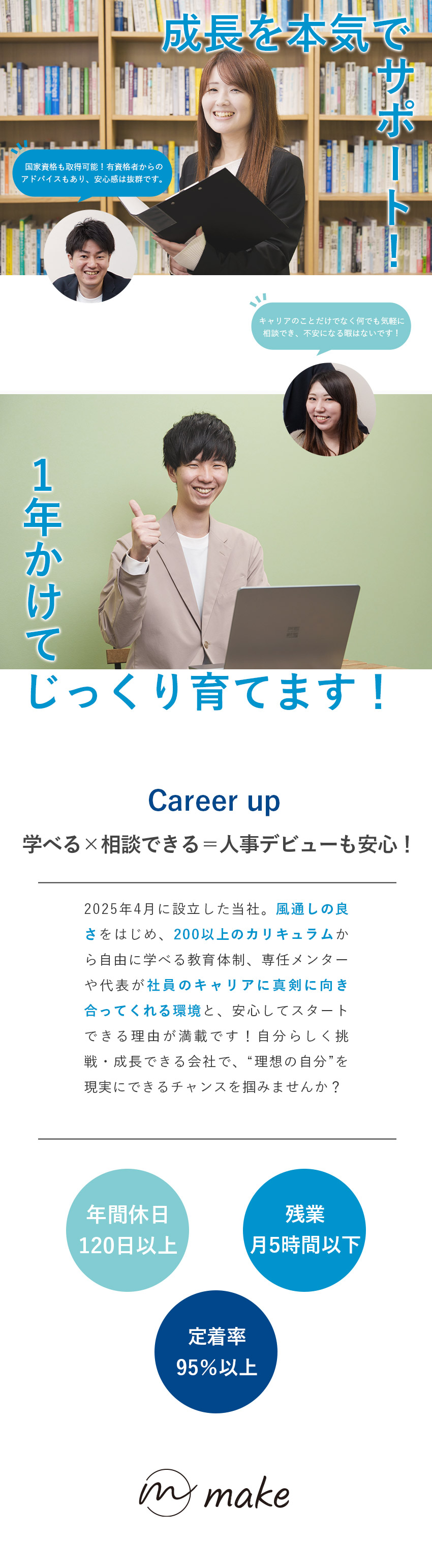 一番の魅力は、何と言っても『安心してスタート&成長できる環境』であることです。【多彩な研修制度】【資格取得支援制度】【メンター制度】だけではなく【風通しの良さ】も抜群◎会社がより良くなるための提案や挑戦はいくら行ってもOKという社風で、失敗を怒る方は1人もいないとのこと。なぜなら「最初は誰でも失敗するもの。だから、失敗を責めるくらいなら、一緒にどうやったら成功するかを考え、サポートするのがmakeです」と代表の高橋さんが話してくださいました。