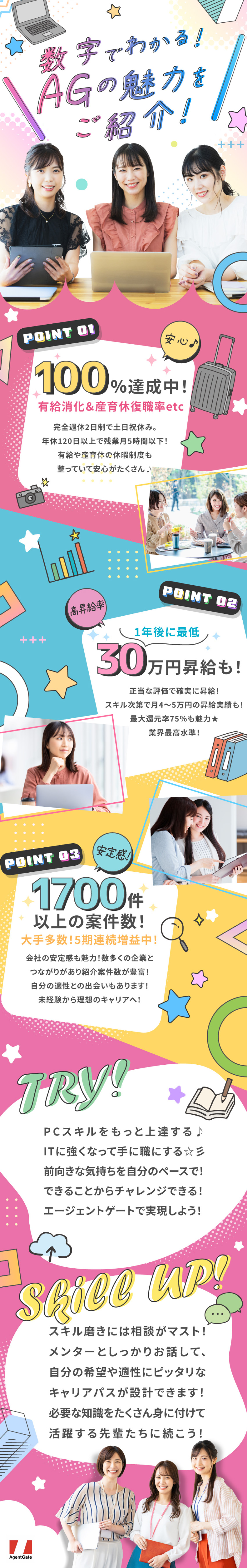 ITや事務のスキルをより磨いて幅広く活躍できる当社。働き方の選択肢がたくさんあるので、「残業はしたくない」「駅チカの勤務先が良い」など、自分の希望に合った環境で仕事をできるのが、本当に嬉しいです!