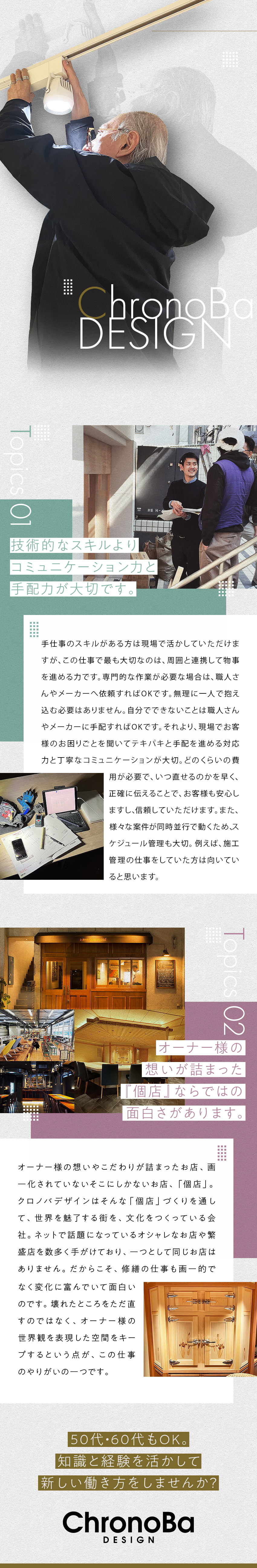 ◆クロノバデザインは、単なる内装工事会社ではありません。オーナー様の想いやこだわりが詰まったお店、画一化されていないそこにしかないお店=「個店」をつくることで、魅力あふれる街づくりに貢献したいと考えている会社です。そしてその個店づくりが、ある街や日本という国の文化にもつながる。そんな仕事ができたらうれしいと考えています。