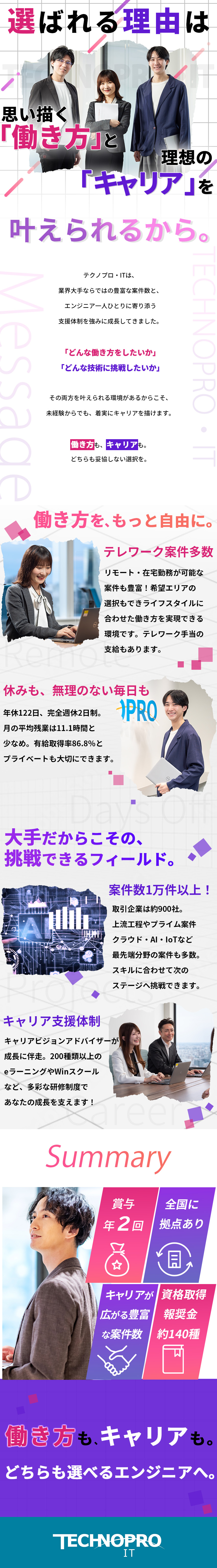 技術を極めるスペシャリスト、チームメンバーを率いるゼネラリスト、どちらも目指せるのがテクノプロ・IT社です。上司やキャリアアドバイザーに相談しながら道を選択できるので一人で悩むようなことはありません。