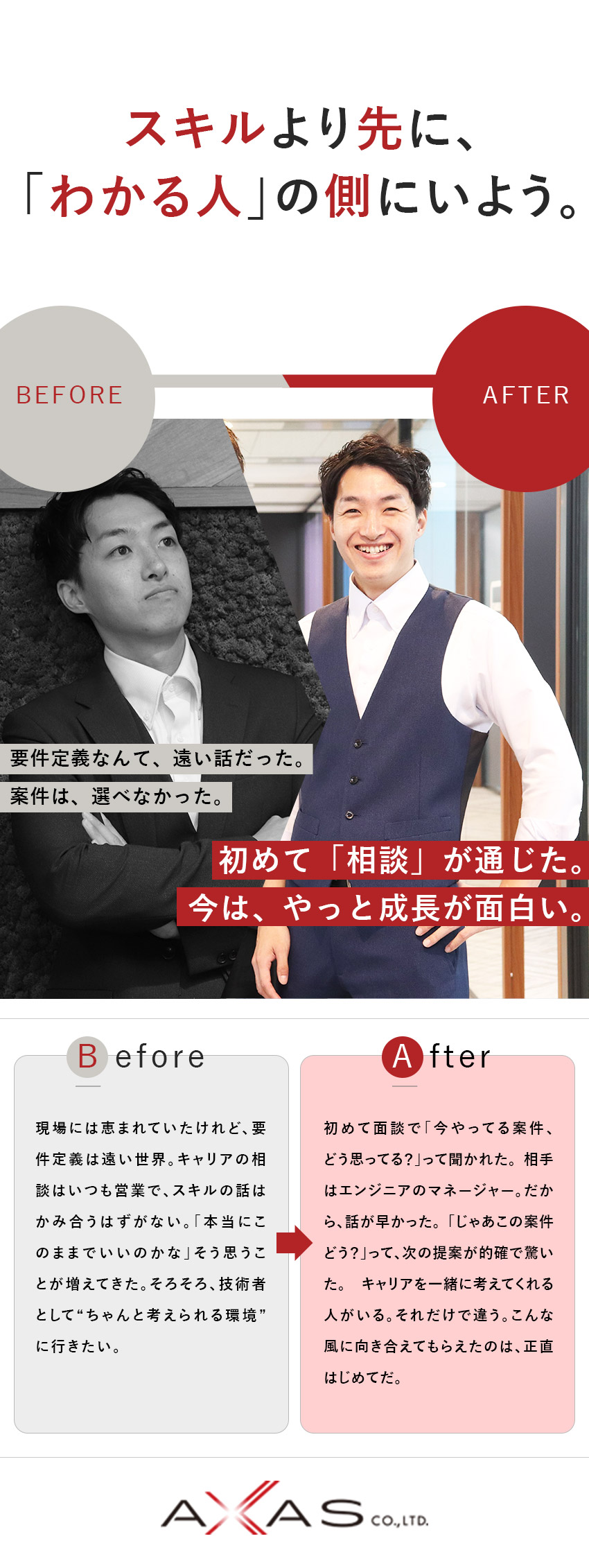 前職では、自分に合わないプロジェクトに携わることも多く、納得感もありませんでした。新しいスキルも身につけられないため、転職を決意。アクサスではプロジェクトはもちろん、スキルのことまで相談できています。
