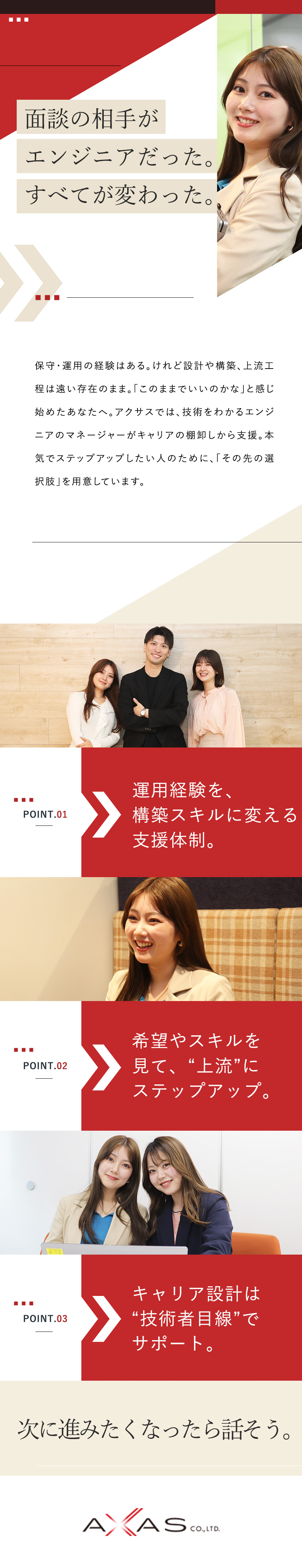 前職は、インフラ領域のプロジェクトが少なかったため、将来のキャリアを考える上で不安があり、転職を決意。いくつかの候補からアクサスを選んだ理由は、インフラ領域に注力しているところに魅力を感じたためです。