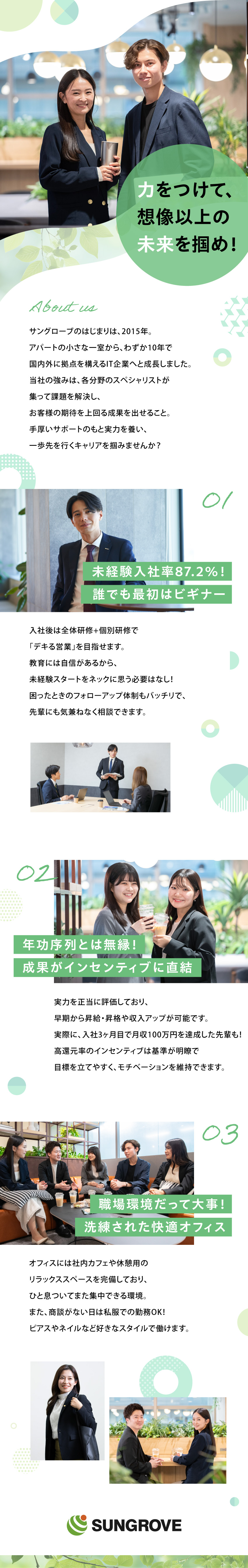 顧客が抱える課題を解決するため、商材だけではなく課題解決の企画を行う商談を実施します。プロフェッショナルとして顧客へアドバイスすることもあるため、成約時には「こんなにちゃんと提案してくれると思っていなかった」「商材導入後が楽しみ」という声をいただくことも。顧客の未来を創造することが、サングローブの、そして日本経済の発展へと繋がる大事なポジションです。もちろん、その分報酬や昇格などで還元します!