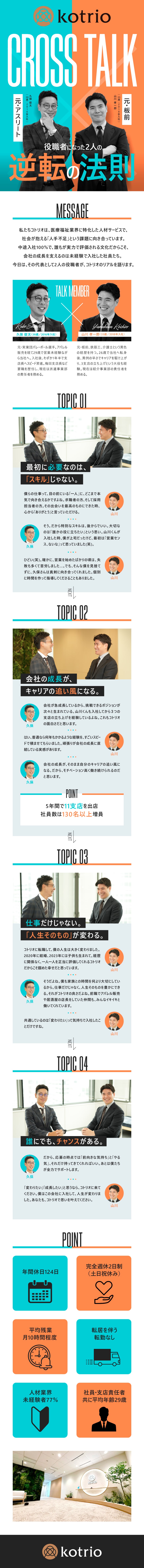 意思決定は驚くほどスピーディー。社歴や経験は関係ありません。誰もが挑戦できる風土がコトリオには根付いています。あなたの「こうしたい!」というアイデアが、明日の会社の戦略になることも。社会の課題解決に直結するような大きな仕事に、若いうちから主体的に関われるチャンスも豊富です。出る杭は伸ばす文化。挑戦を恐れず、自らの手で未来を切り拓きたい、そんなあなたにとって最高のフィールドがここにあります。