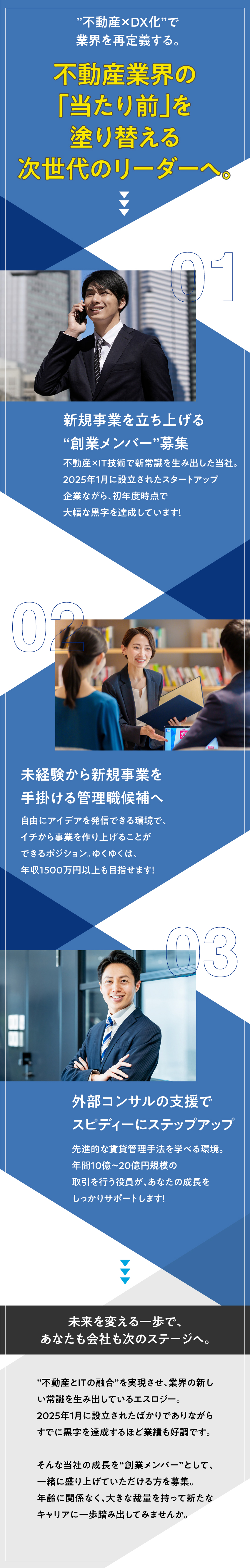 役員と共に賃貸管理事業部を立ち上げるため、事業の根幹から関わることができます。自分のアイデアや提案が形になり、オーナー様や入居者の満足度向上に直接つながるため、会社の成長と自身の成長を実感できる仕事です。さらに、高収益ビジネスモデルの中核に携われるため、将来的には年収1,500万円以上を目指すことも可能です。