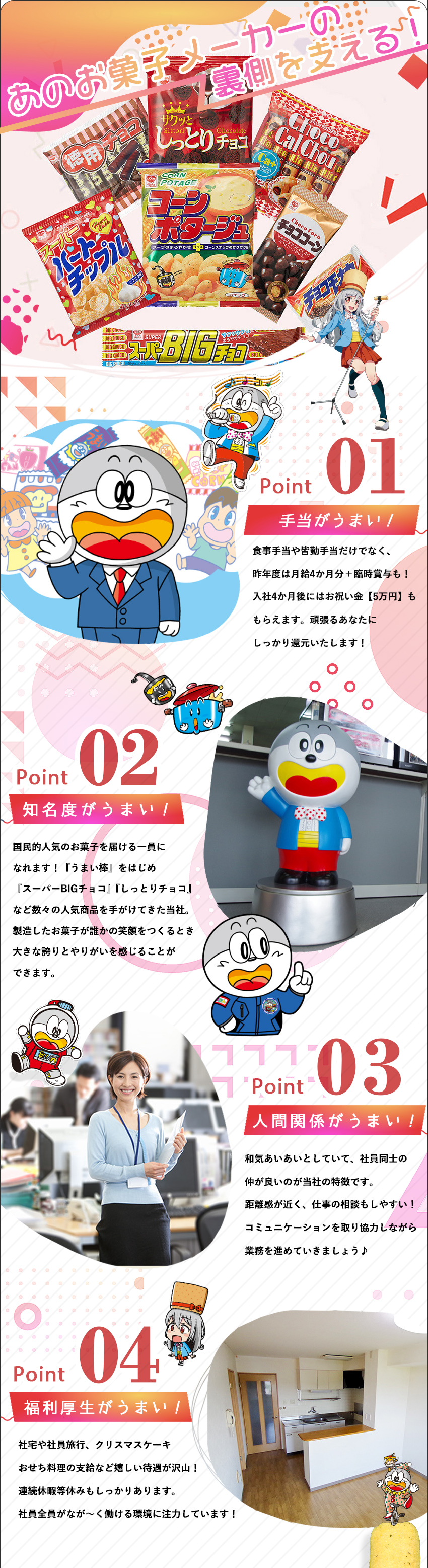 世界的に知られているお菓子『うまい棒』のメーカーで勤務できるという事や、そんな会社の成長を共にできる点に魅力を感じ入社しました。