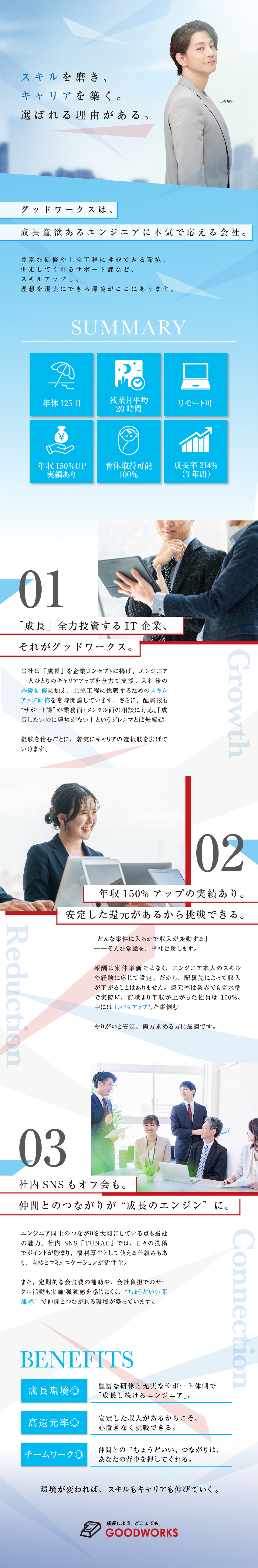 スキルに見合った正当な評価が受けられること。それが、グッドワークスの大きなやりがいです。還元率は業界でも高水準の75%~85%を誇り、前職よりも年収が下がることはありません。