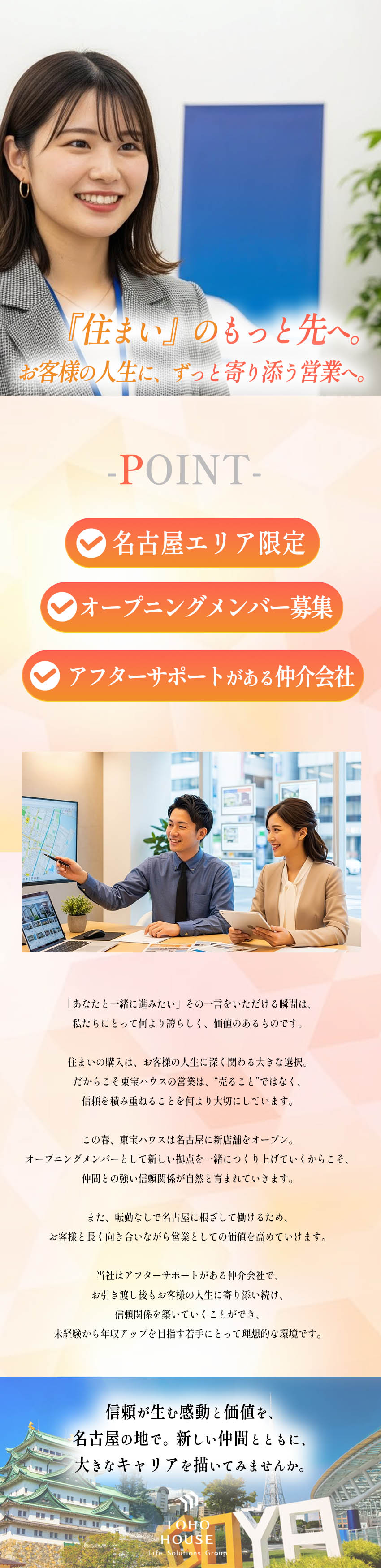 この春、東宝ハウスが名古屋に新店舗をオープン!オープニングメンバーとしてゼロから立ち上げるチームだから、同期と一緒に成長できる環境です。未経験から不動産営業へのチャレンジを応援します。転勤なしで名古屋で働けるため、地域に根ざしお客様と長く向き合い営業としての価値を高めていけます。
