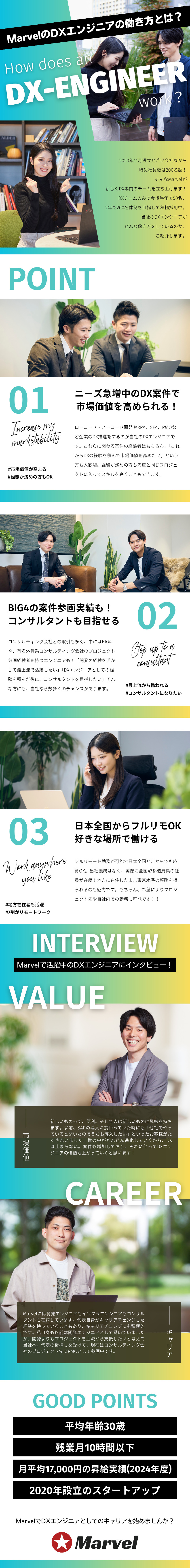 実際にMarvelにも多くのDX案件が寄せらせていて、同社のDX部門は今後半年で50名体制、2年後には200名体制を目指すという。開発、インフラでも躍進が続く同社の第三の事業の柱であるDX部門で経験を積むことで、あなたもエンジニアとしての市場価値を高めてはいかがだろうか。