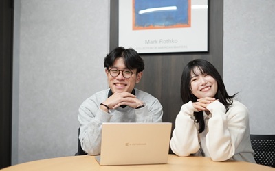 IT経験者として入社したSさん(写真左)がまず驚いたのは、未経験スタートの先輩にも自然と尊敬できる環境があること。チーム内には「こうなりたい」と思える先輩が多く、日々良い刺激を受けながら働けているという。教育面でも、従来の一方的なインプット中心ではなく、自ら考え発信するアウトプット型の学びが特徴で、理解の深まりと成長実感につながっている点が印象的だった。また、経験やスキルに関係なくフラットに支え合う風土が根付いており、「働きやすさ」と「成長環境」が両立している職場であることが強く伝わってきた。