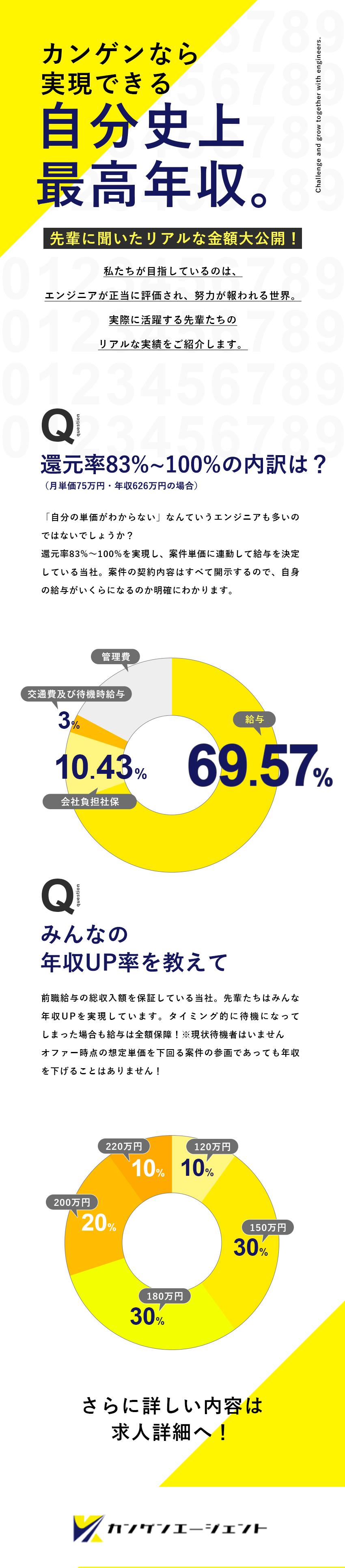 前職は年功序列の環境で、スキルが上がっても収入に反映されにくい状況に不満がありました。カンゲンでは単価連動型なのでスキルが上がれば単価が上がる、単価が上がれば収入が上がるので満足しています!