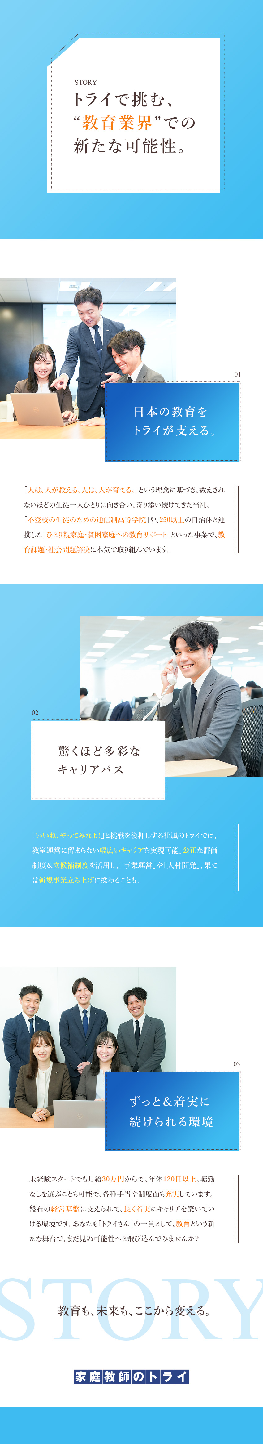 当社は「人は、人が教える。人は、人が育てる。」という信念のもと、教育の本質を問い続けてきました。家庭教師、個別教室、オンライン教育、不登校支援等の事業は「一人ひとりの夢・目標を実現する」ことから始まっています。私たちは個別最適な学びの追求のため、最新技術を活用し、教育のあり方を変革しようとしています。テクノロジー進化や社会の価値観が多様化する今こそ、教育をアップデートすべきと考えます。この想いに共感し未来のトライを創っていける方との出会いを楽しみにしております。