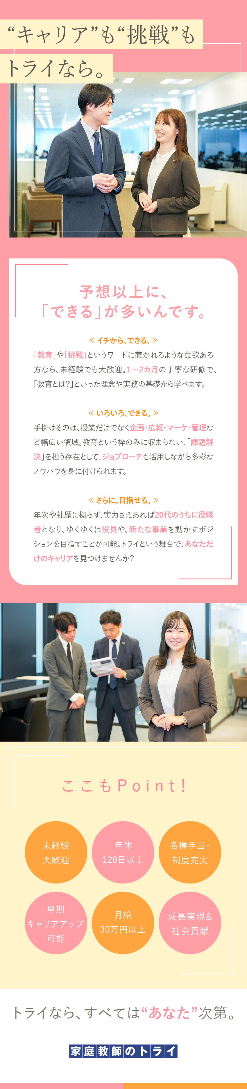当社は「人は、人が教える。人は、人が育てる。」という信念のもと、教育の本質を問い続けてきました。家庭教師、個別教室、オンライン教育、不登校支援等の事業は「一人ひとりの夢・目標を実現する」ことから始まっています。私たちは個別最適な学びの追求のため、最新技術を活用し、教育のあり方を変革しようとしています。テクノロジー進化や社会の価値観が多様化する今こそ、教育をアップデートすべきと考えます。この想いに共感し未来のトライを創っていける方との出会いを楽しみにしております。