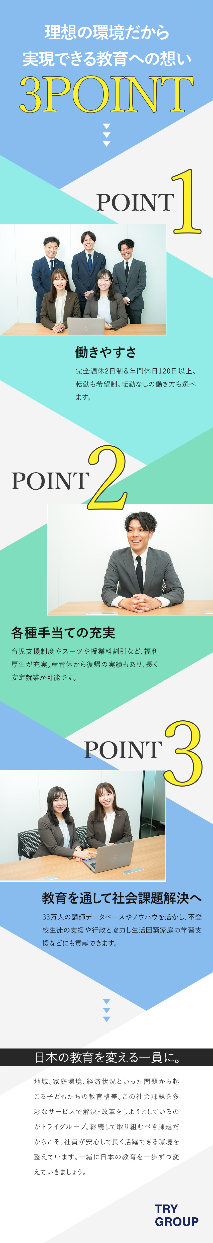 当社は「人は、人が教える。人は、人が育てる。」という信念のもと、教育の本質を問い続けてきました。家庭教師、個別教室、オンライン教育、不登校支援等の事業は「一人ひとりの夢・目標を実現する」ことから始まっています。私たちは個別最適な学びの追求のため、最新技術を活用し、教育のあり方を変革しようとしています。テクノロジー進化や社会の価値観が多様化する今こそ、教育をアップデートすべきと考えます。この想いに共感し未来のトライを創っていける方との出会いを楽しみにしております。
