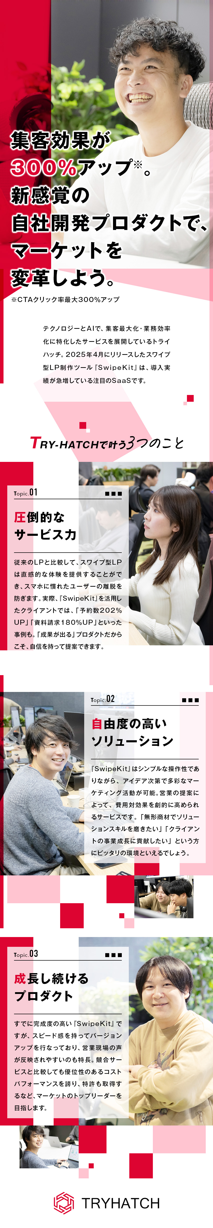 株式会社トライハッチは2018年の創業以来、『SaaS×Data×WebMarketing』をかけあわせ、マーケティングの属人化をなくし、高水準で成果を出し続ける会社を目指しています。