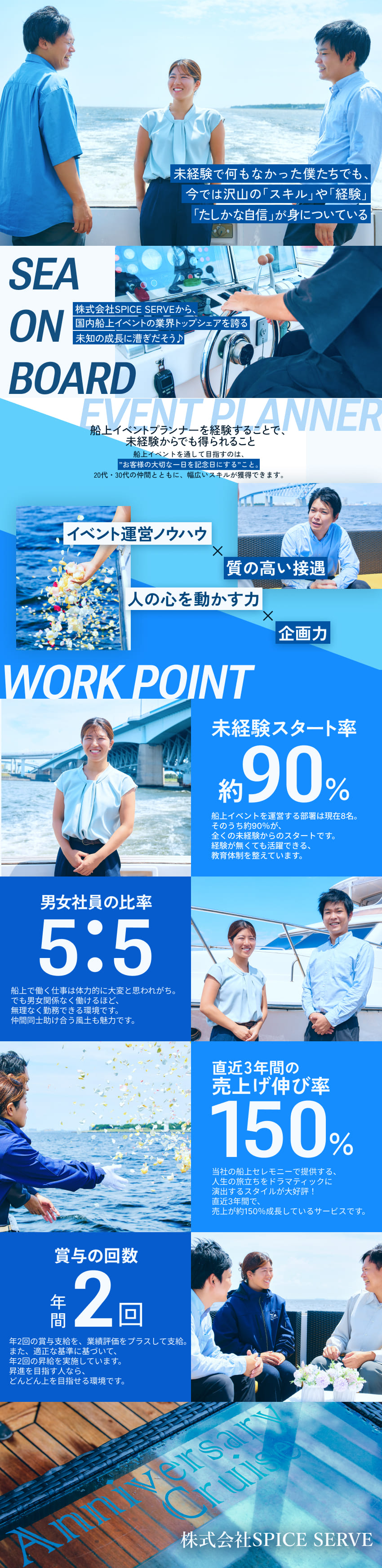 また、海上×イベント×企画×接遇の各分野は、他社ではなかなか一度に経験できないものばかり。お客様からの口コミ評価も非常に高いことからも、質の高いスキルが習得できることがわかります。キャリアアップを目指したい人なら、成果を出してどんどん昇進することも可能。自分に合わせた働き方ができることも、このポジションならではの魅力です。