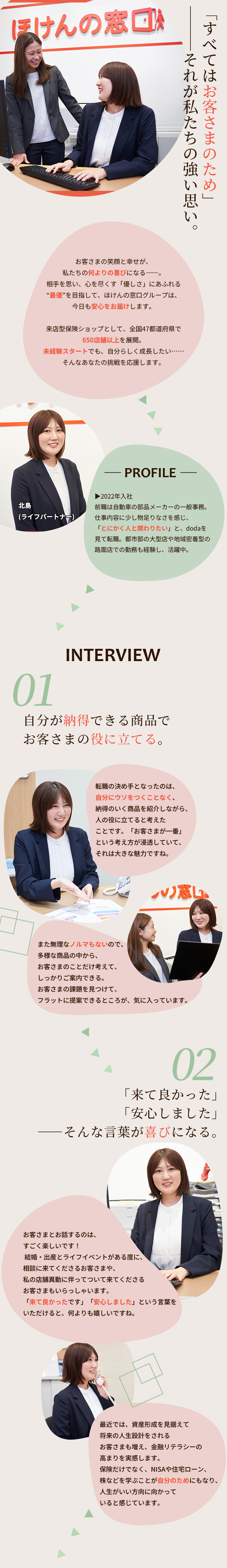「仕事もプライベートもすごく楽しいです。お客さまの笑顔が何よりも嬉しいですし、私自身が保険の勉強をして生活が変わり、転職して本当に良かったです!」と温かな笑顔で語ってくださった北島さん。
