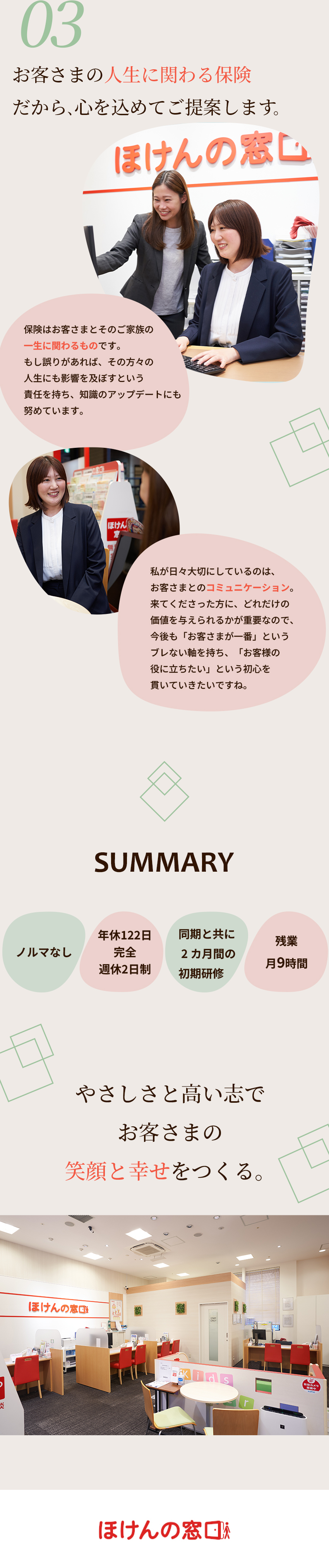 個人ノルマはなく、特定の商品に偏ることもないので、お客さま本位で最適な保険商品をご提案できるのが当社の大きな強み。それがお客さまやご家族の安心と幸せをつくるという喜びを糧にしながら、成長できるステージです。