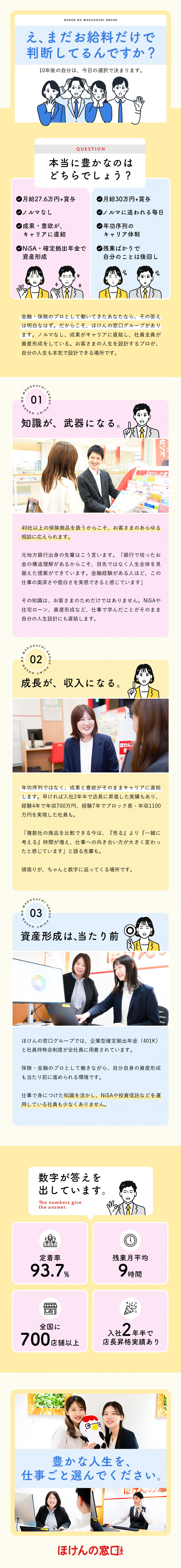地方銀行出身の井上さんは、ご主人の転勤を機に転職。「全国展開しているから、転勤があっても仕事を続けられる安心感がありました」と話します。住宅・教育・年金・資産形成など、人生設計そのものを支える提案ができる環境だからこそ、銀行で培った知識がそのまま武器になる。知識も資産も育っていく。それが、ほけんの窓口グループで働くということです。