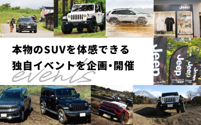 競合他社が国内に多数ある中お客様に選んで頂けるオンリーワンの存在になる為、ジープの持つ本物のSUVを体感できる独自のイベントを企画・開催。キャンプ場貸切りの「NATURE MEETING」、スリル満点の「オフロード走行会」などお客様を招待して一緒にジープのある生活を楽しみ、ファンを増やしています。