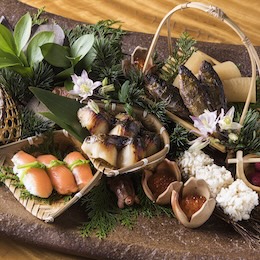 備前焼の器と共に、職人の技と叡智が生み出す至極の料理を提供。米は奥丹波産をはじめ自然の恵みにこだわり、魚や野菜も地域の生産者から厳選。土壁や漆喰、総無垢材を用いた自然素材の空間には、手仕事の温もりと深みが息づいています。