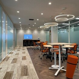 明るく開放的な空間「アテナテラス」。社員同士の気軽な打ち合わせや、来客時にも使われています。