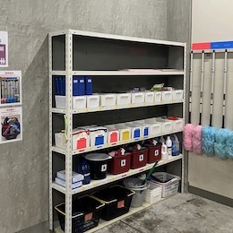 ボックスの色分けや配置決めにより、清掃用具をきれいに整頓。お客さまからも喜ばれています。