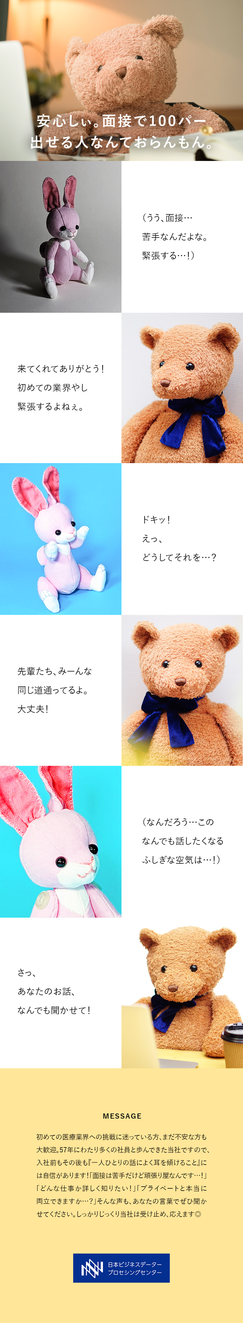 実は事務の能力よりも、医師や患者様に誠実に接するコミュニケーション力が大事な仕事。『相手の話をよく聞く』『納得いただけるように話す』ことができる方なら、スキルや知識もだんだんついていきますよ。