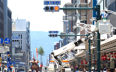 また、京都の夏を彩る祇園祭では、私たちの技術力が大きな力に。信号機の転回作業を担当したスタッフがその腕を存分に発揮したそうです。地域とのつながりを大切に、地元の人たちと一緒にイベントを支えるやりがいを実感しながら働けるのも同社ならではの魅力です。