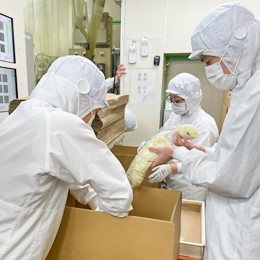 ライン上を流れてきた麺を段ボール箱に詰めたり、粉や添加物の補充を行います。