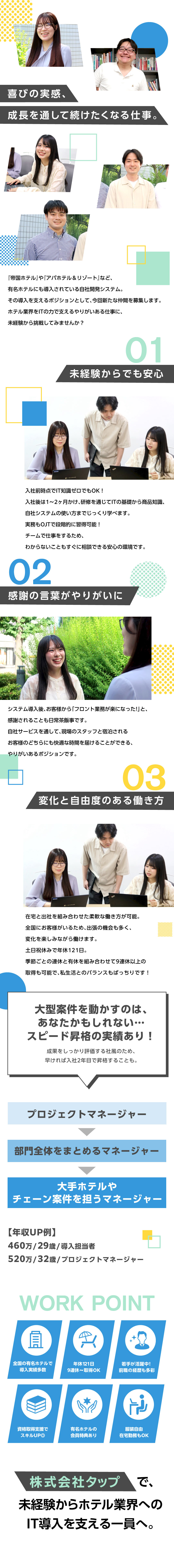 また、ホテル向けシステムを扱うためIT知識を学び続ける姿勢が必要で、24時間稼働する業界を支える立場として、